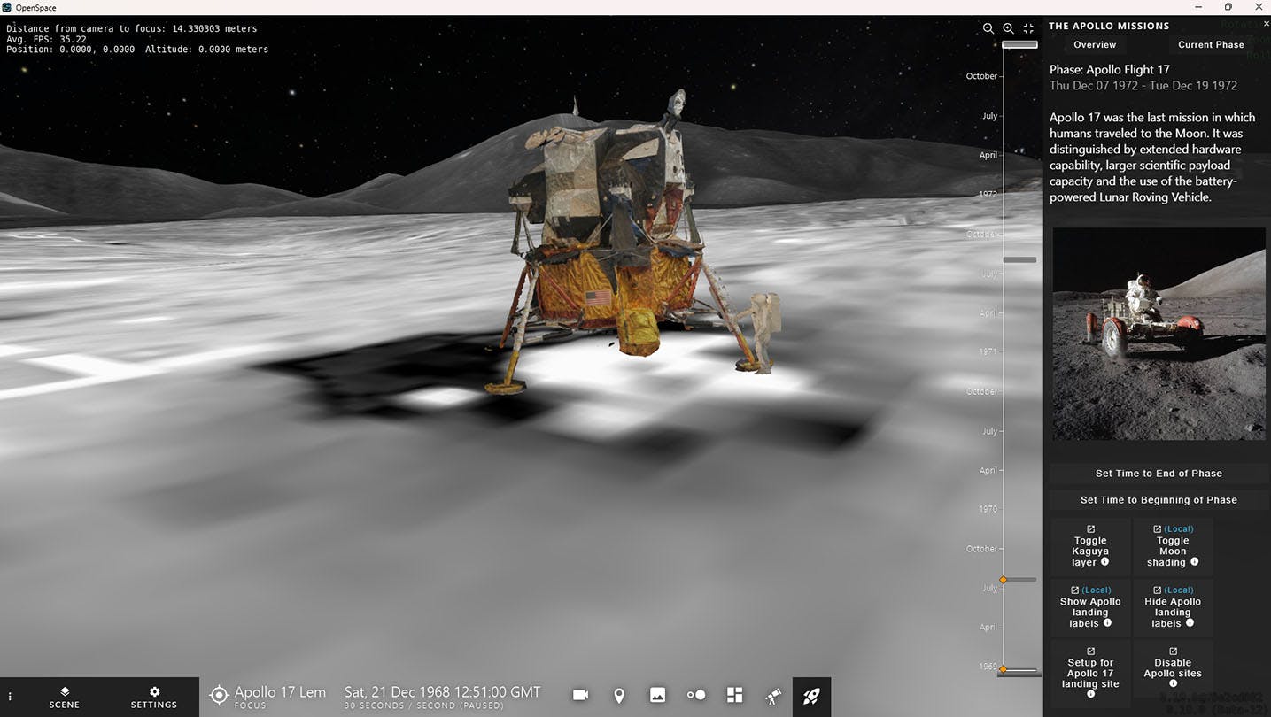 Als het programma gestart is, zie je rechts informatie over het Amerikaanse Apollo-programma waarmee voor het eerst (en tot nu toe ook voor het laatst) mensen op de maan werden gezet. Links daarvan zie je een tijdbalk. Ga daar naar december 1972 voor de Apollo 17-missie, de laatste bemande vlucht. Klik op het tabblad Current Phase, scrol omlaag en klik op Setup for Apollo 17. Klik op Focus, kies Apollo 17 LEM en vlieg ernaartoe. Je kunt nu de laatste plek verkennen waar mensen hebben rondgelopen en -gereden.