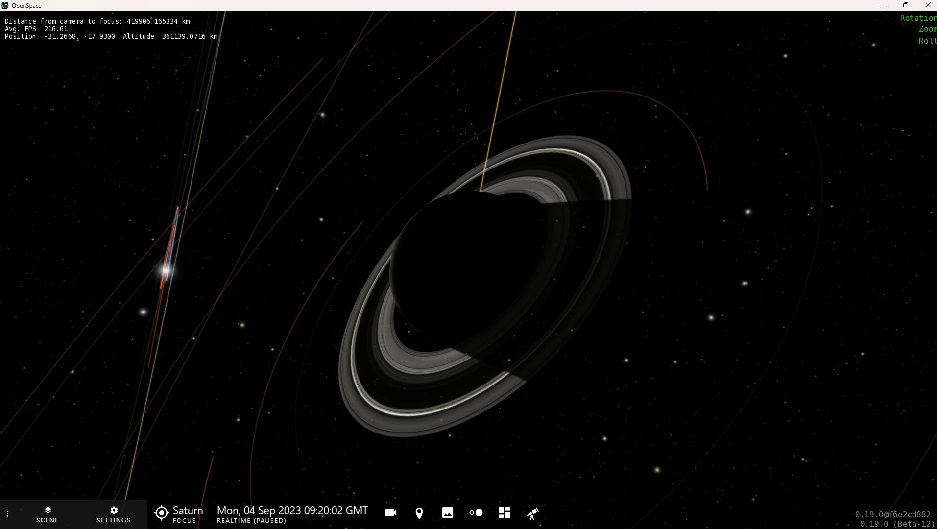 Mocht je denken dat het aantal objecten dat OpenSpace kan tonen wel erg karig is, dan vergis je je. Klik nogmaals op Focus en typ sat. Er verschijnen verschillende opties waaronder Saturn: de geringde planeet Saturnus. Klik op het vliegtuigpictogram daarachter om ernaartoe te vliegen en bekijk de planeet van alle kanten. Behalve Saturnus zie je ook de banen van zijn manen. En kijk je richting de zon dan zie je ook de banen van de binnenplaneten.