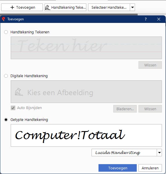Je kunt ook op elke gewenste plek een handtekening in je document zetten. Het creëren van je handtekening kun je op verschillende manieren doen: met de muis tekenen, een afbeelding ervan importeren of gewoon je naam intypen.