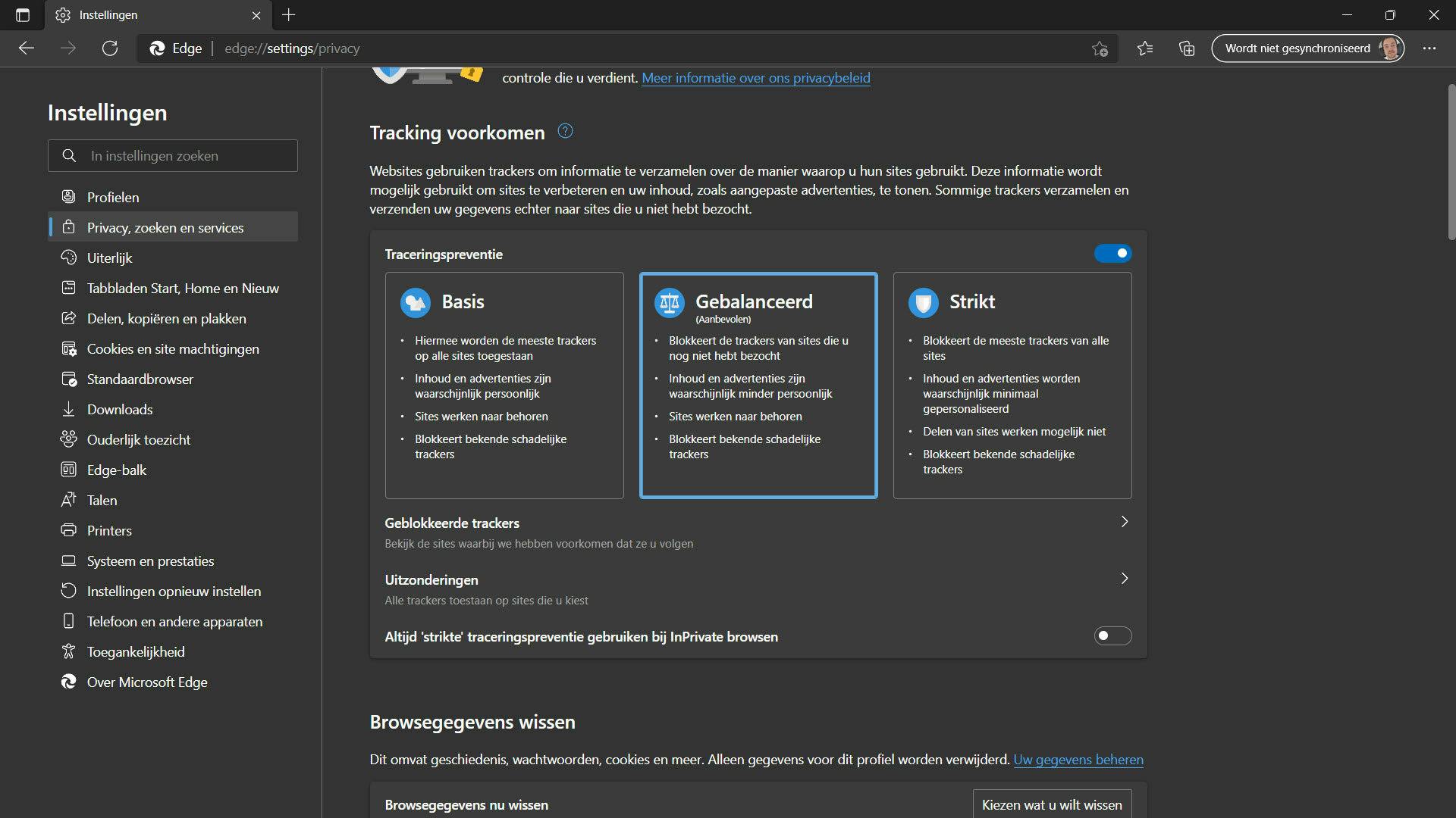 Daarnaast kun je met Microsoft Edge ervoor zorgen dat websites je niet volgen online. Ook dit is een zeer welkome toevoeging aan de browser, maar de optie vreet wel voorzieningen die je mogelijk voor andere dingen nodig hebt. Je kunt eens uitproberen of een andere instelling minder zwaar voor je computer is; en anders schakel je hem uit, kijken of dat helpt. Dat doe je als volgt. Binnen de Instellingen ga je naar Privacy, zoeken en services. Onder het kopje Tracking voorkomen zie je staan welke instelling nu actief is. Strikt blokkeert de meeste dingen, maar vraagt ook veel van je pc. Zet hem eens op Gebalanceerd en anders op Basis, om te kijken of Microsoft Edge wat sneller wordt.