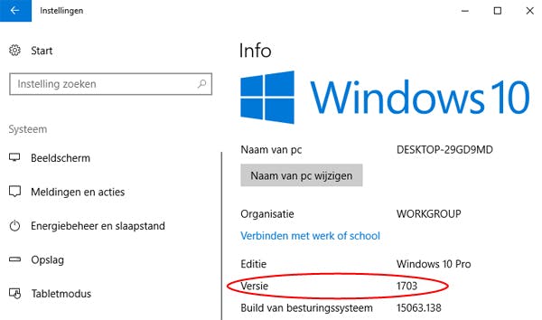 Het betreft de originele versie van Windows 10, zoals deze werd gelanceerd op 29 juli 2015. Het versienummer daarvan is 1507. Om te achterhalen welke versie op jouw systeem geïnstalleerd staat, ga je naar Instellingen > Systeem > Info > Versie.