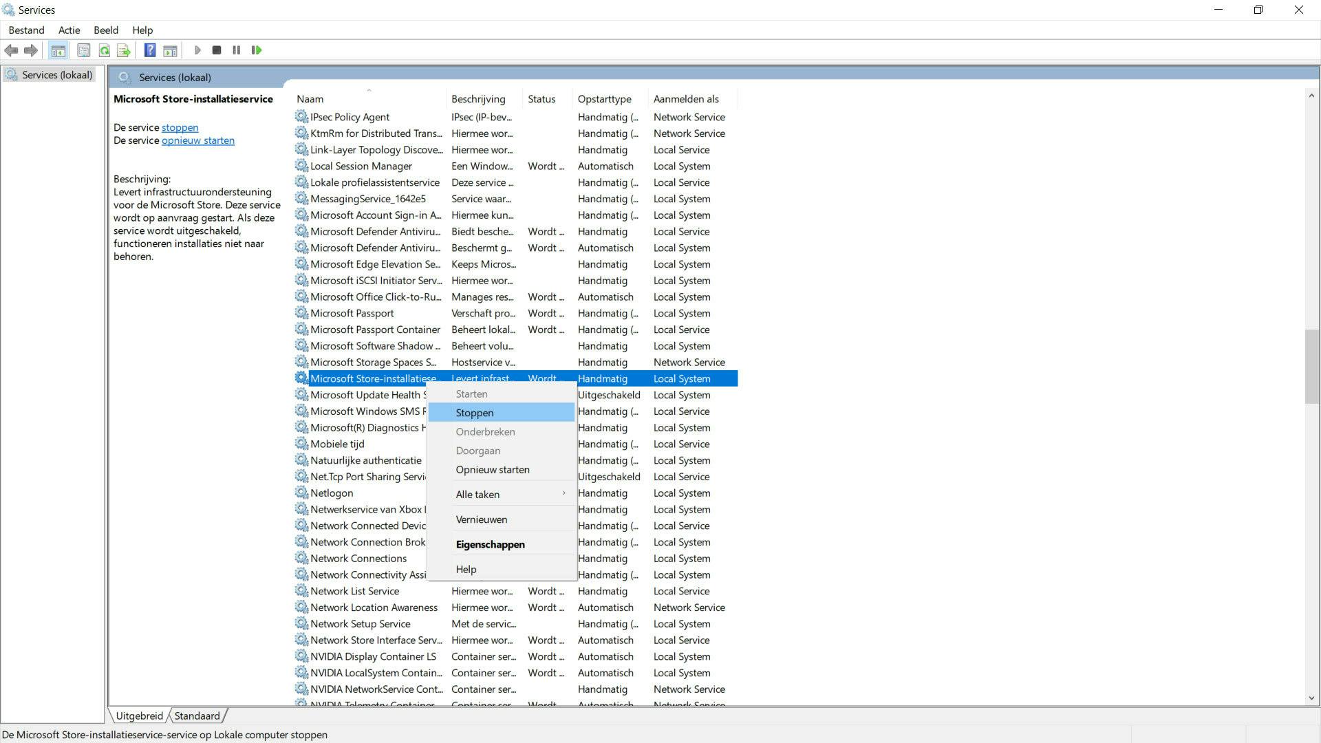 - Zoek in de alfabetische lijst de Microsoft Store-installatieservice op