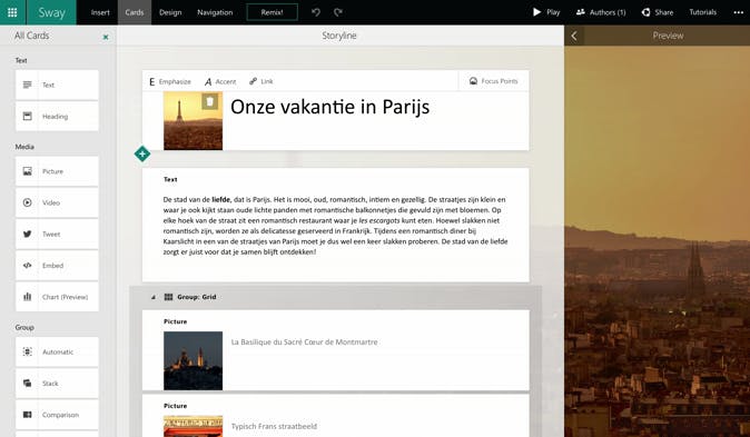 Alle ingevoegde content komt in je Storyline terecht. Dit is een overzicht van alles in je Sway. Hier kun je tekst toevoegen en aanpassen, foto's en video's groter of kleiner maken, en aangeven welke content bij welke groep hoort. Deze manier van ordenen is heel overzichtelijk. Ook is het aanpassen van de volgorde op deze manier simpel: je sleept je kaarten naar de plek waar je ze hebben wilt.