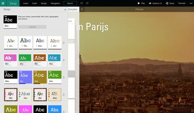 Bij Design verander je het ontwerp van je Sway. Er kan gekozen worden uit vooraf ingestelde thema's, waarna deze aangepast kunnen worden. De aanpassingen zijn helaas niet heel geavanceerd, wat ertoe kan leiden dat alle Sways op elkaar gaan lijken. Hier zou Microsoft meer aandacht aan moeten besteden om de software aantrekkelijker te maken voor professionele doeleinden.