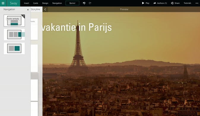 Bij Navigation wordt bepaald hoe lezers door je Sway navigeren. Je kunt kiezen voor drie opties: van boven naar beneden, van links naar rechts, en zelfs nog voor de traditionele PowerPoint-manier (één dia per keer).