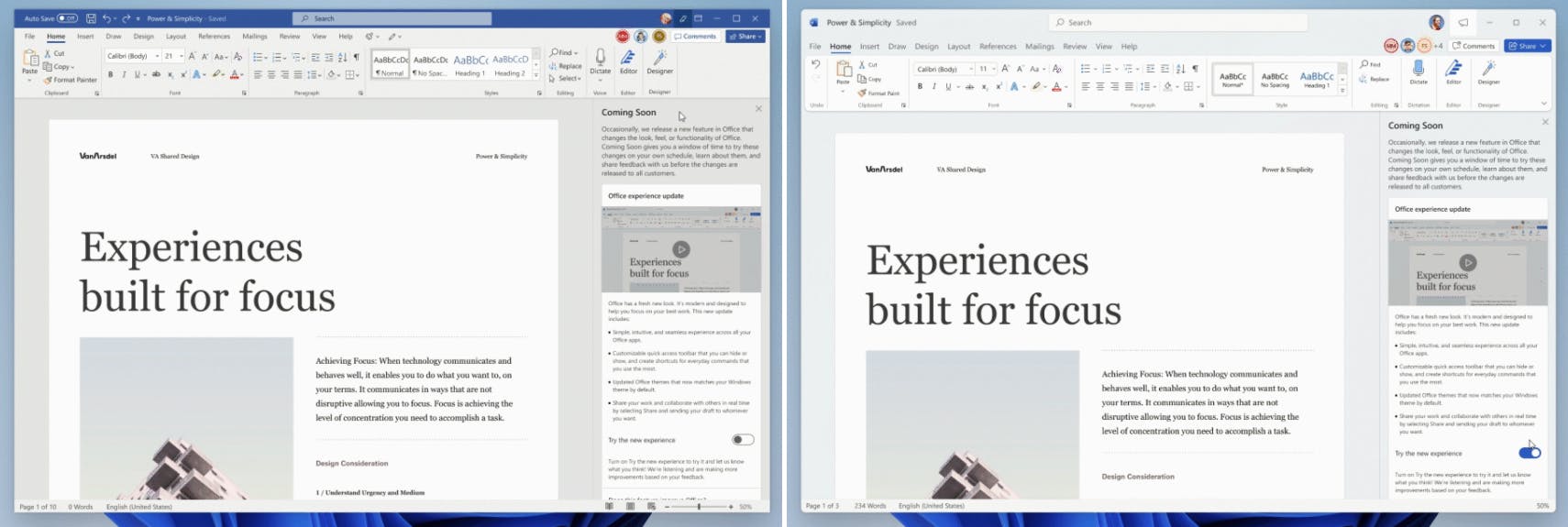 Microsoft werkt aan een nieuw ontwerp voor zijn Office-programma's, met de nadruk op een rustige uitstraling voor het verbeteren van je concentratie. Wie zich heeft aangemeld als Office Insider, kan de opgefriste interface alvast proefdraaien.