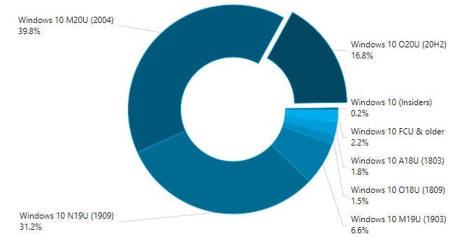De meeste mensen zitten nog op de mei-update van 2020 (40 procent) en de oktober 2019-update (31 procent), mogelijk omdat de installatie van deze onderdelenupdates tot wel een jaar is uit te stellen. Onderstaande cijfers zijn vorige maand nog gemeten.