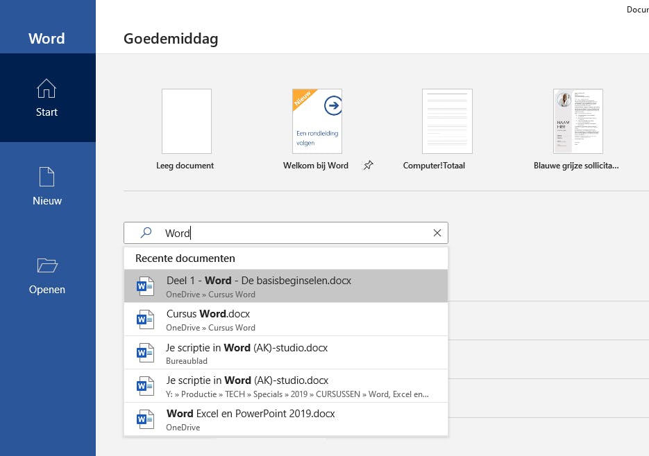 Werk je regelmatig in de cloud en is aan dat account ook bijvoorbeeld OneDrive of SharePoint gekoppeld? Dan kun je onder het item Gedeeld met mij snel bepaalde documenten vanuit de cloud openen. Ook hier worden de meest recent door jou bewerkte documenten meteen weergegeven. Als iemand anders dus wel een document met jou heeft gedeeld, maar je deze zelf nog niet in Word hebt geopend, wordt dat bestand niet weergegeven in deze lijst. Het maakt dat dit overzicht vooral dient als een lijst met snelkoppelingen. Kun je je document niet direct vinden? Dan kun je ook online van het zoekvenster gebruikmaken om je document te vinden. Als je een zoekopdracht invoert, komt Word met suggesties van zowel documenten op de harde schijf als de bestanden die in OneDrive of SharePoint staan.