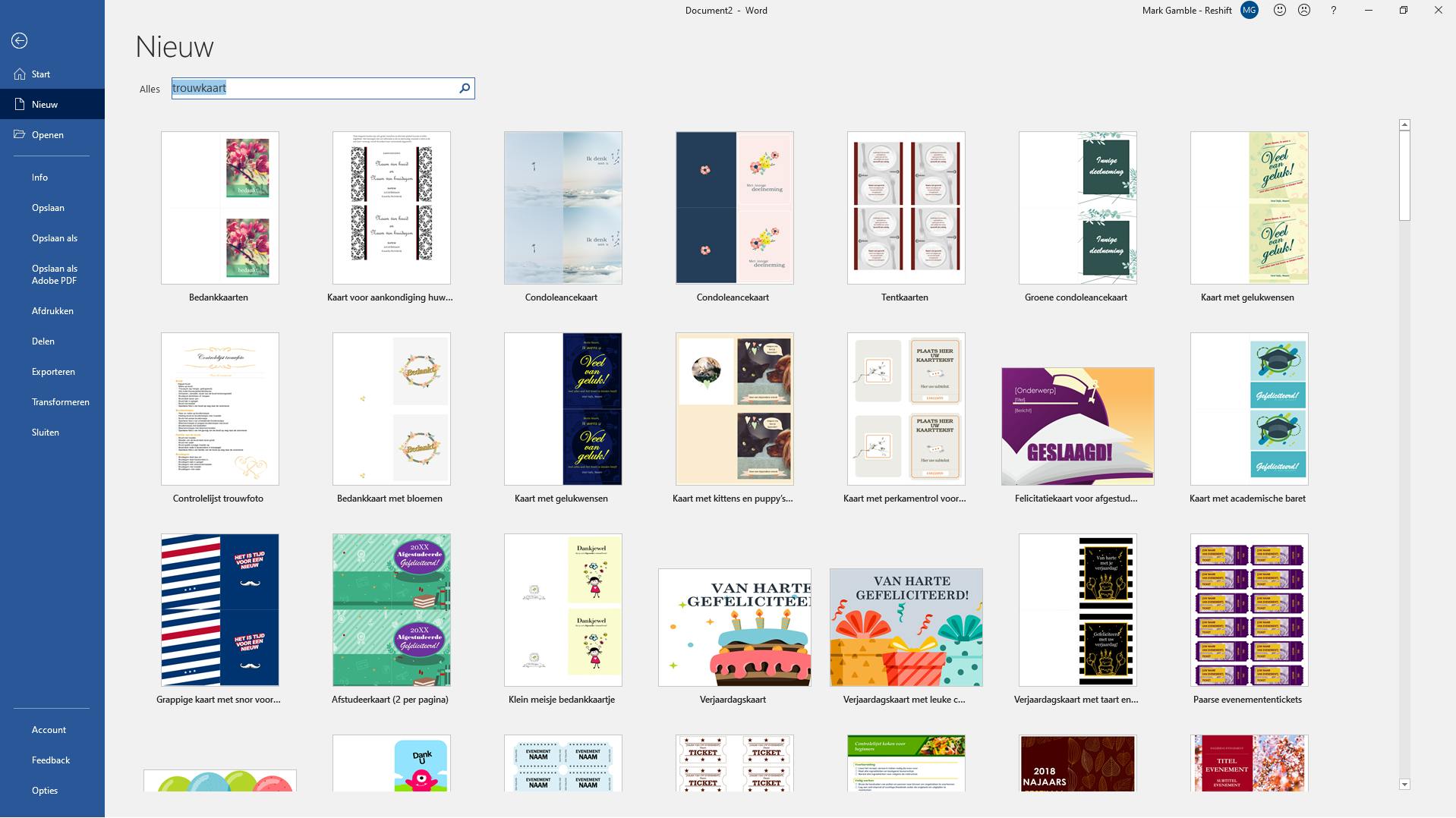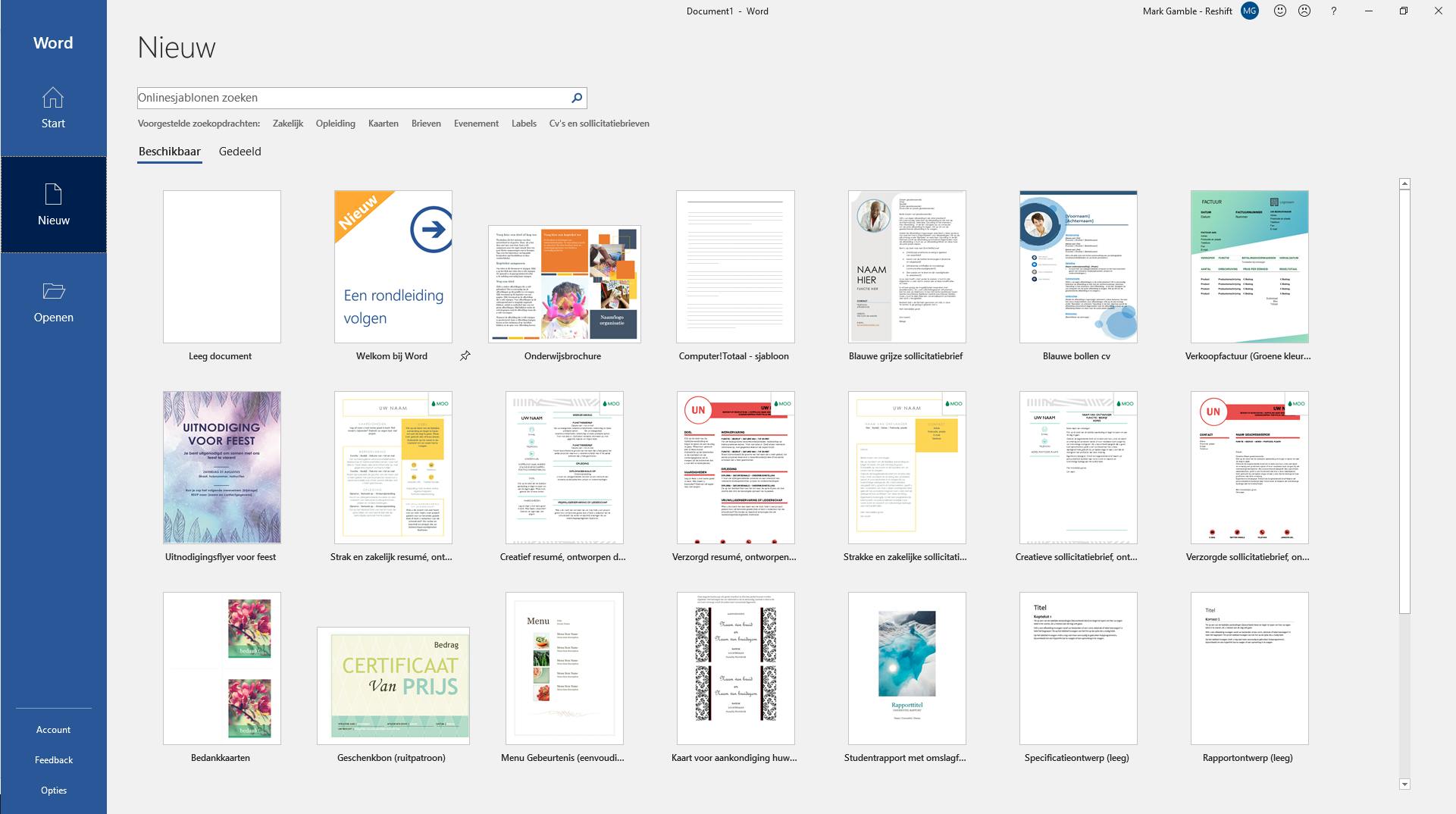 Ben je op zoek naar een heel specifiek sjabloon? Dan kun je bovenin op een van de categorieën klikken om de sjablonen te filteren op soort. Zo kun je onder meer kiezen uit zakelijke sjablonen, brieven, labels (om af te drukken) en sjablonen voor cv’s en sollicitatiebrieven. Ook hier vind je een zoekveld waarin je een trefwoord kunt invoeren om een bepaald sjabloon te vinden. Heel secuur werkt deze functie echter niet. Typ je bijvoorbeeld ‘trouwkaart’, dan komt Word ook met voorbeelden van rouwkaarten. Gelukkig geeft Word een fysiek voorbeeld van het document, zodat je goed kunt bepalen of hetgeen je zoekt er ook tussen zit.
