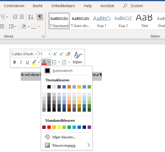 Naast het wijzigen van het lettertype kun je ook kleuren in je tekst gebruiken, bijvoorbeeld als je wilt dat een bepaald deel van de tekst eruit springt. Ga niet over de top met het gebruik van kleuren, dat maakt het document onleesbaar en onprofessioneel. Het wijzigen van de kleur van de tekst gaat op dezelfde manier als het wijzigen van het lettertype, namelijk door een stuk tekst te selecteren met de linkermuisknop ingedrukt. Laat je de muisknop los, dan verschijnt het pop-menuutje weer. Daar klik je nu op het pictogram ‘A’ met het kleurenbalkje eronder. Er komt een kleurenpalet tevoorschijn waar je een kleur voor je geselecteerde tekst kunt kiezen door erop te klikken.