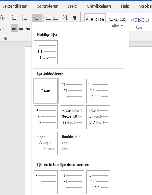 Ingewikkelde juridische teksten bevatten vaak tal van hoofd- en subteksten. Bijvoorbeeld een hoofditem, genaamd Artikel 1, met daaronder tien voorwaarden. Moet jij een keer iets dergelijks maken, maak dan gebruik van de functie Niveaus. In het lint vind je onder Alinea het blokje Niveaus, het derde knopje van links.