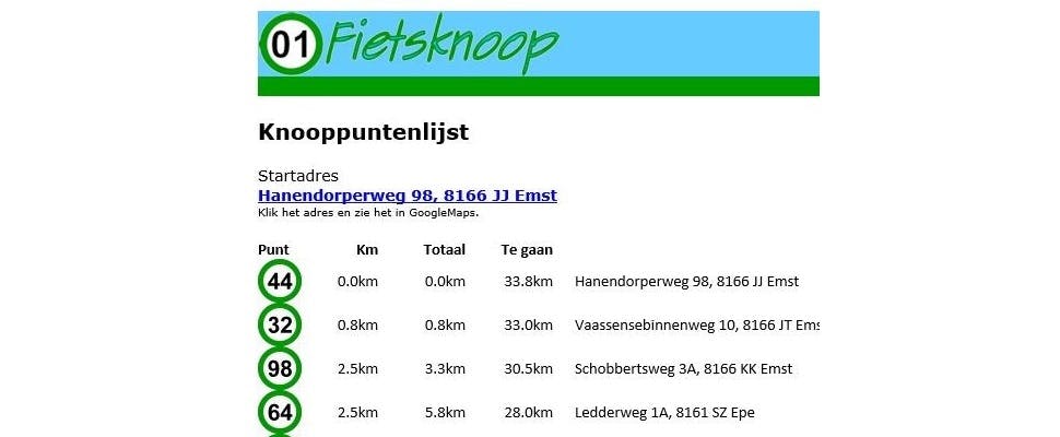 Je hebt ze vast weleens gezien naast het fietspad: fietsknoop-borden. Je ziet een groen-omrand nummer (of soms meer nummers) en pijltjes die aangeven waar je een knooppunt (want dat is wat de nummers aangeven) kunt vinden. Het fietsen van een route wordt zo heel makkelijk. In plaats van onthouden dat je na de eerste boerderij naar rechts moet, dan het zandpad moet oversteken en vervolgens na driehonderd meter, voorbij die eik waar de bliksem in geslagen is, weer linksaf moet fiets je gewoon van nummer naar nummer. Makkelijker kan niet!