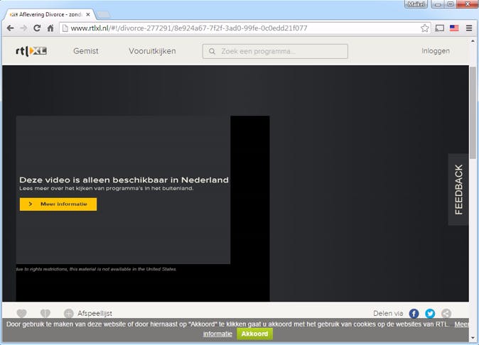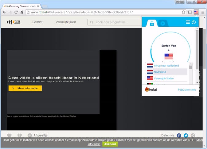 Hola is een gratis VPN-aanbieder die functioneert via een peer-to-peernetwerk. Hierbij geven gebruikers via virtuele tunnels elkaar toegang tot websites waarbij er een regiorestrictie geldt. Deze dienst werkt vanuit de meeste landen probleemloos, al kunnen we je geen garanties geven. Omdat Hola zeer gebruiksvriendelijk is en niets kost, raden we je aan om het eerst eens uit te proberen wanneer je van plan bent om met een computer of notebook naar uitzendingen te kijken. Werkt het niet? Dan kun je altijd nog een andere VPN-aanbieder uitproberen (zie stap 5). Surf met de browser Chrome of Firefox naar www.hola.org en klik op Get Hola, it's free. Voeg de plug-in vervolgens toe aan je browser. In Uitzending Gemist of een andere Nederlandse videodienst open je daarna een tv-programma. Klik boven in de browser op het pictogram met het vlammetje om de instellingen van Hola te openen. Je klikt vervolgens op het vlaggetje, waarna je kiest voor Nederland. De Nederlandse vlag verschijnt in de browser. In de meeste gevallen kun je de uitzending nu terugkijken.