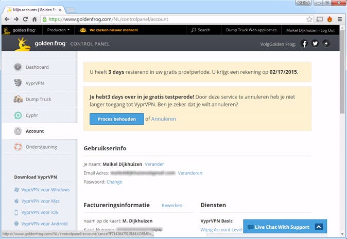 Tijdens een buitenlandse weekendtrip, hoef je geen betaald account te nemen bij VyprVPN. Om te voorkomen dat deze aanbieder geld afschrijft, zet je het abonnement voortijdig stop. Surf naar www.goldenfrog.com en log rechtsboven via Controle Paneel in met je accountgegevens. Klik links op Account en kies bij iedere dienst voor Service verwijderen. Klik tot slot op Log Out om het online beheerpaneel af te sluiten.