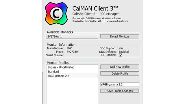 Installeer en start de Calman Client 3. Die doet dienst als patroongenerator; je kunt er verschillende icc-profielen met één muisklik in selecteren. Kijk na dat je monitor gevonden is en activeer DDC indien je monitor dit ondersteunt. Creëer een nieuw profiel en geef het een duidelijke naam (bijvoorbeeld sRGB – Gamma 2,2). Calman zal je vertellen in welke stappen DDC een automatische kalibratie toelaat. Je kunt dan ook altijd het DDC-venster oproepen en rechtstreeks aanpassingen maken.