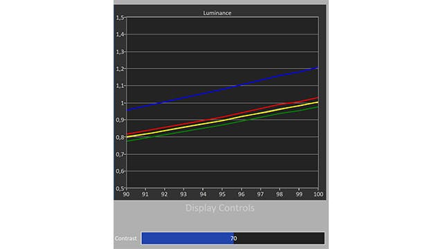Als tweede stap kijkt Calman het dynamisch bereik na: is alle witdetail zichtbaar en vrij van kleurtinten? Zet het contrast op maximum en voer een meting uit. Als de rode, groene en blauwe lijnen parallel lopen, is alles ok. Is dat niet het geval, laat dan het contrast zakken en doe een nieuwe meting. Herhaal tot de lijnen grosso modo parallel lopen.