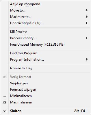 Voordat we u gaan vertellen hoe handig dit programma is, eerst even een korte waarschuwing, aangezien men u vraagt om nog een ander programma te installeren tijdens de installatie. Deze optie staat standaard aangevinkt. Wanneer WindowMenuPlus is geïnstalleerd, wordt het direct geminimaliseerd naar het systeemvak. Hier wordt kort een melding van gegeven, maar deze is redelijk eenvoudig te missen. Het programma is dus automatisch actief na het installeren. U merkt dit door met de rechtermuisknop op een titelbalk van een venster te klikken. In plaats van de gebruikelijke paar opties, kunt u nu kiezen uit een hele lijst. U kunt bijvoorbeeld de transparantie van het venster instellen, aangeven dat het programma altijd op de voorgrond moet staan, het laten verspringen naar een hoek van het scherm, het proces vanuit het venster afsluiten enzovoort. Een andere handige functie is dat u kunt zien hoeveel geheugen het programma gebruikt en eventueel ongebruikt geheugen kunt 'vrijmaken'. Via het pictogram in het systeemvak kunt u vervolgens aangeven welke zaken u wel en niet wilt tonen in het menu, zodat u enigszins controle hebt over de functionaliteit van het programma.