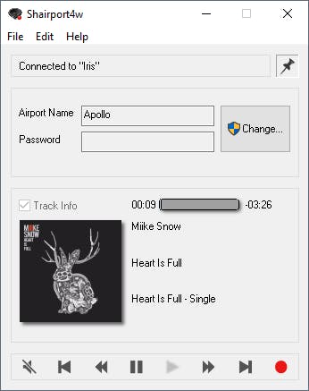 Je kunt tijdens het afspelen gewoon vanaf je iPhone of iPad de muziek pauzeren. Dat is eventueel ook mogelijk in Shairport4w. Zo zijn er knoppen om het huidige nummer te pauzeren, door of terug te spoelen of het volgende of vorige nummer af te spelen. Overigens is het niet mogelijk om video’s af te spelen naar Shairport4w.