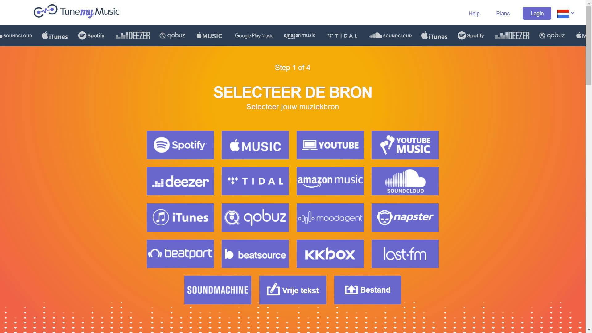 Voordat we kunnen beginnen, heb je een account nodig bij de dienst die je voortaan wil gebruiken. Je logt in bij Spotify (of een andere bron) en je logt in bij de nieuwe partij. Ga nu naar de website van de third-party dienst en druk op de grote knop in beeld waar Laten we beginnen staat. Dit is de eerste van de vier stappen, waar je een overzicht te zien krijgt van bronnen die ondersteund worden. Voor het gemak hebben we er een screenshot van gemaakt, zodat je weet wat je kunt verwachten.