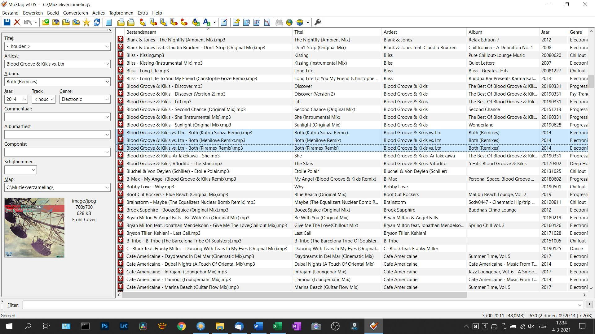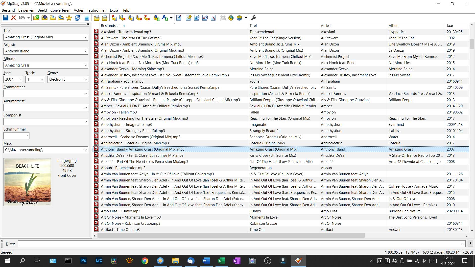 Zodra je met de muis of de pijltjestoetsen een nummer in de lijst uitkiest, worden links de belangrijkste informatievelden uit de metadata getoond. Ook de coverafbeelding is er te zien, als die aanwezig is natuurlijk. Mocht er informatie ontbreken of iets niet kloppen, dan kun je dit hier alsnog aanvullen. Zodra alle wijzigingen voor dit muzieknummer zijn aangebracht, klik je op Opslaan in de werkbalk en kun je dit eventueel herhalen met een volgend nummer. Wat ook kan is velden in het overzicht zelf aanpassen. Die wijzigingen worden automatisch in het muziekbestand bewaard, dus klikken om op te slaan is niet nodig.
