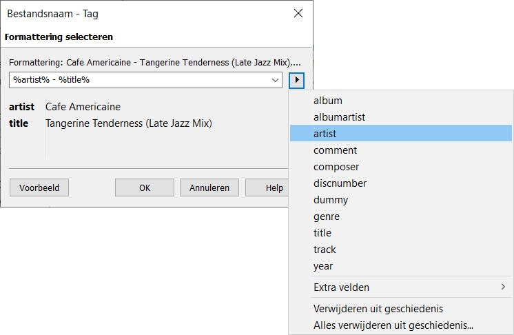 Vervolgens opent een venster waarin je de veldnamen opgeeft waaruit de bestandsnaam is opgebouwd. In ons voorbeeld is dat dus %artist% - %title%. Ook de liggende streepjes (of een ander scheidingsteken) geef je dus op. Eronder zie je meteen een voorbeeld verschijnen van hoe de bestandsnaam wordt gesplitst in losse velden, zodat je zeker weet dat het allemaal goed gaat. Klik in dat geval op OK en nu bevatten de betreffende informatievelden alsnog de correctie informatie. Andersom gebruik je Converteren, Tag - Bestandsnaam als de informatie in de metadata wel kloppen en je dit graag in de bestandsnaam wilt zien terugkomen.