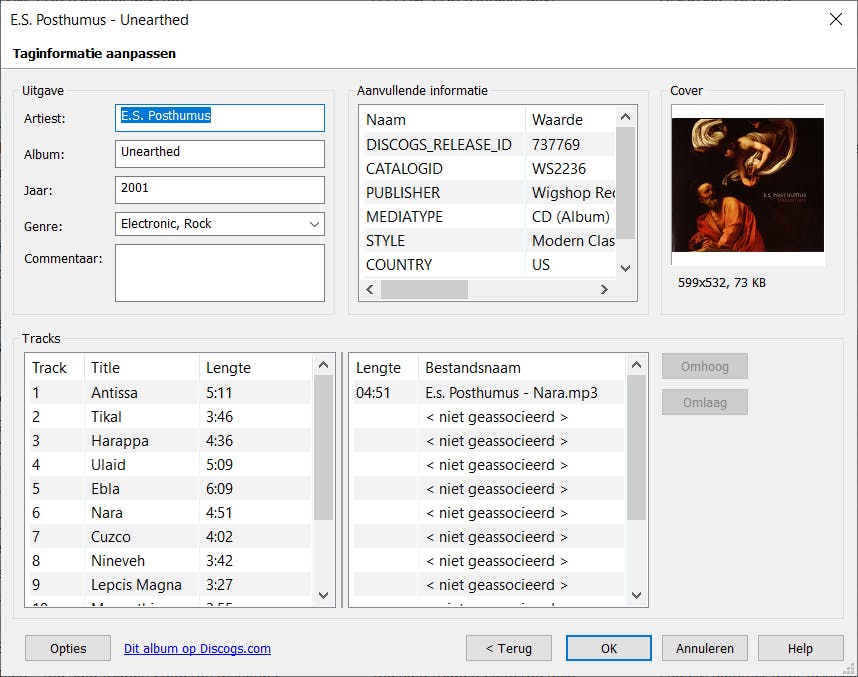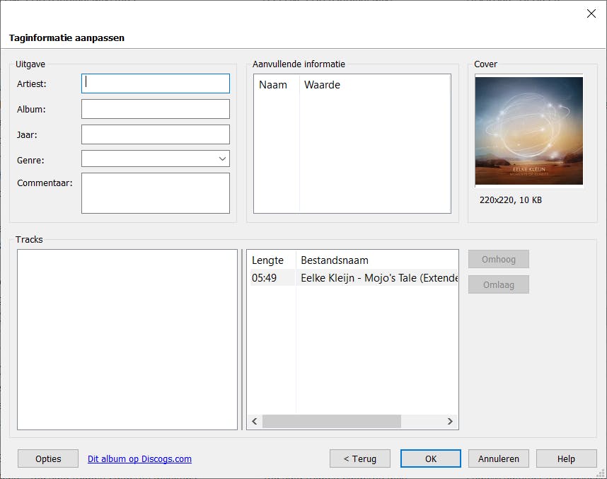 In het vervolgvenster zie je een overzicht van de gevonden informatie en kun je eventueel het een en ander nog handmatig bijstellen. Met een beetje geluk is meteen ook een geschikte coverafbeelding gevonden. Klik op OK als je tevreden bent en deze gegevens in het geselecteerde muziekbestand wilt opnemen. Of klik op Terug om toch nog even bij een ander exemplaar uit de zoekresultaten rond te snuffelen.