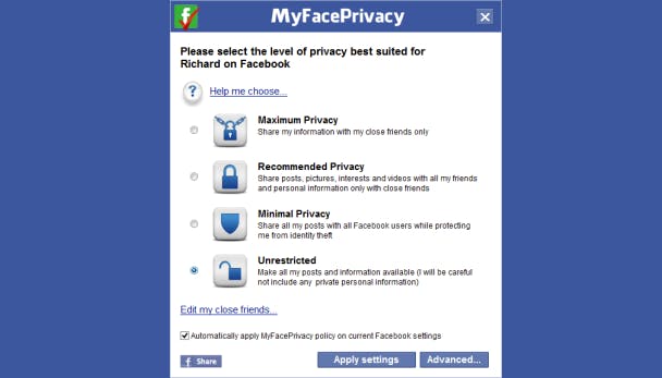 Hierna log je in op je Facebook-profiel, het duurt even voordat het programma op je profiel is ingelogd. In het beginscherm van het programma heb je de keuze uit vier instellingen. Kies je voor Maximum Privacy, dan wordt je informatie alleen met vrienden gedeeld. De meest soepele optie is Unrestricted, iets wat niet aan te raden is. Wil je meer keuzevrijheid, klik dan op Advanced om meer instellingen te bepalen. Standaard staat het vinkje voor Automatically apply MyFacePrivacy policy on current Facebook settings aan, op deze manier worden de instellingen automatisch naar Facebook verzonden als je op Apply settings klikt.