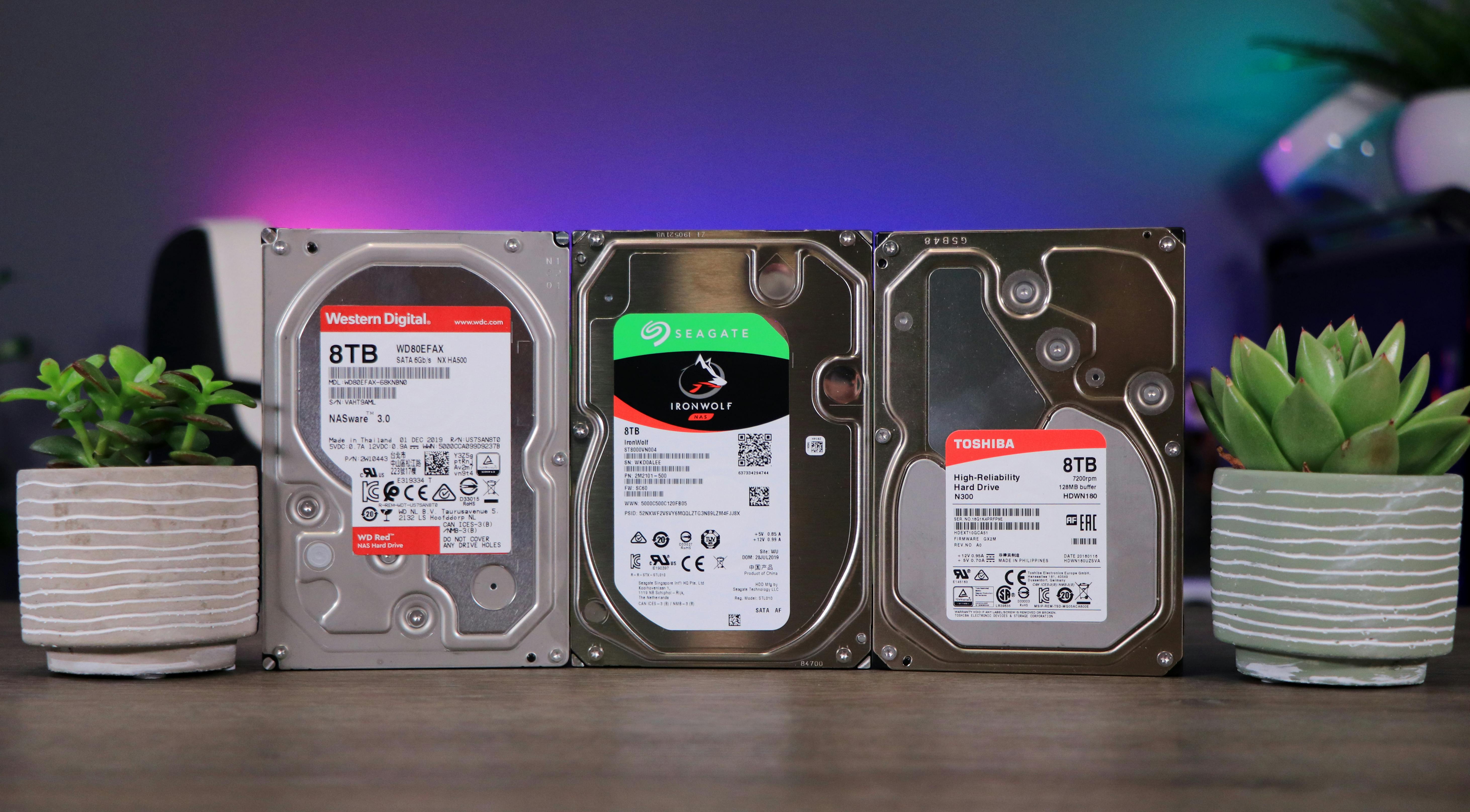 Zoek je een 8TB-schijf, dan komt je keuze uit op de WD Red, Seagate IronWolf of Toshiba N300. Alle drie de schijven zijn gemaakt zijn om 24/7 te draaien, circa 180 TB per jaar te verwerken en zouden normaal gesproken tientallen jaren mee moeten gaan. Het blijven beloftes, maar gezien alle drie fabrikanten drie jaar garantie geven, zien we daar vooralsnog geen winnaar.