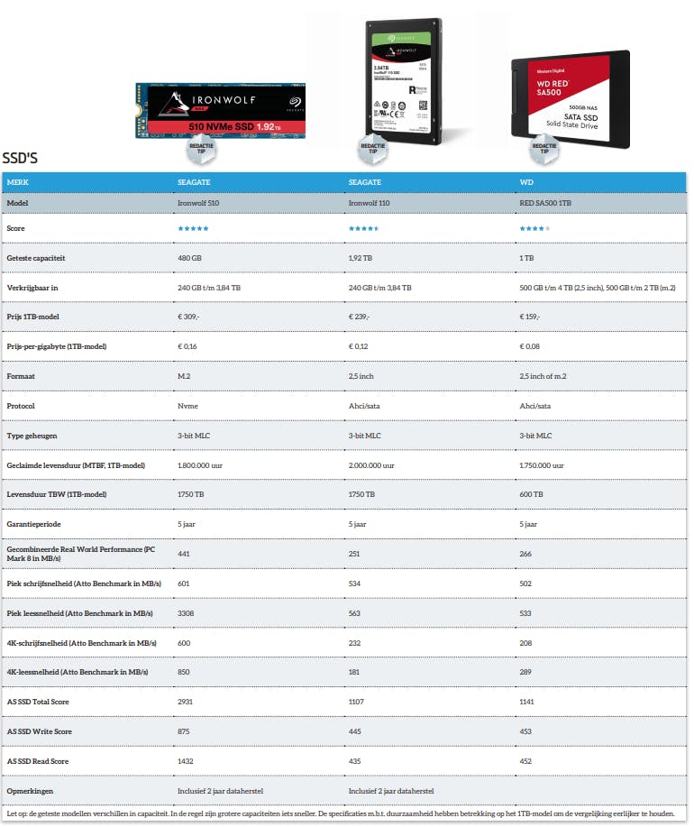 De keerzijde is wel dat de Seagate NAS-ssd’s veel duurder zijn dan hun WD-tegenhanger. En termen als ‘technisch’ en ‘op papier’ geven al aan waar onze zorg zit: uit ervaring weten we dat zelfs instap consumenten-ssd’s vele jaren meegaan en enorme hoeveelheden data kunnen verwerken. Dat WD weinig meer gedaan lijkt te hebben dan wat kleine (firmware-)tweaks op hun consumenten-ssd uit te voeren, klinkt weliswaar als een goedkoop verhaal, maar in de praktijk zal ook deze ssd je data vele jaren veilig kunnen vasthouden of als cache kunnen functioneren. Zeker als consument die de NAS niet extreem belast, is de forse besparing dan toch weer best aantrekkelijk.