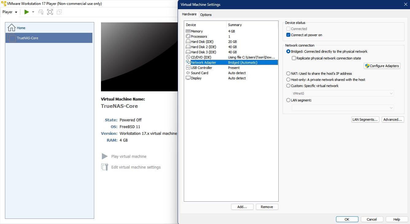 Stel het geheugen bij voorkeur in op 8 GB, maar het kan ook met minder (bijvoorbeeld 4 GB). Selecteer New CD/DVD (IDE), kies Use ISO image file en ga via Browse naar het gedownloade iso-bestand van TrueNAS Core. Via Hard Disk (IDE) / Add voeg je nog extra virtuele schijven toe voor de eigenlijke gegevensopslag. Selecteer Network Adapter, kies Bridged: Connected directly to the physical network, druk op Configure Adapters en plaats alleen een vinkje bij je actieve netwerkadapter. Bevestig met Close en Finish.