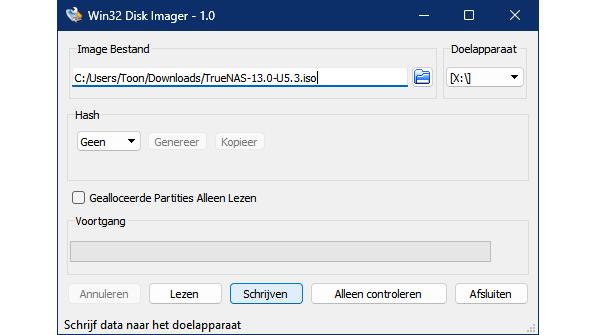 Nu is het tijd om met dit schijfkopiebestand een opstartbare usb-stick te maken. Wij hebben dit zelf succesvol uitgevoerd met de gratis tool Win32 Disk Imager. Na installatie start je de app op, selecteer je een (lege) usb-stick bij Doelapparaat en kies je het gedownloade iso-bestand bij Image Bestand. Laat de overige opties zoals ze zijn, bevestig met Schrijven en Yes. Even later is je opstartbare usb-stick klaar.