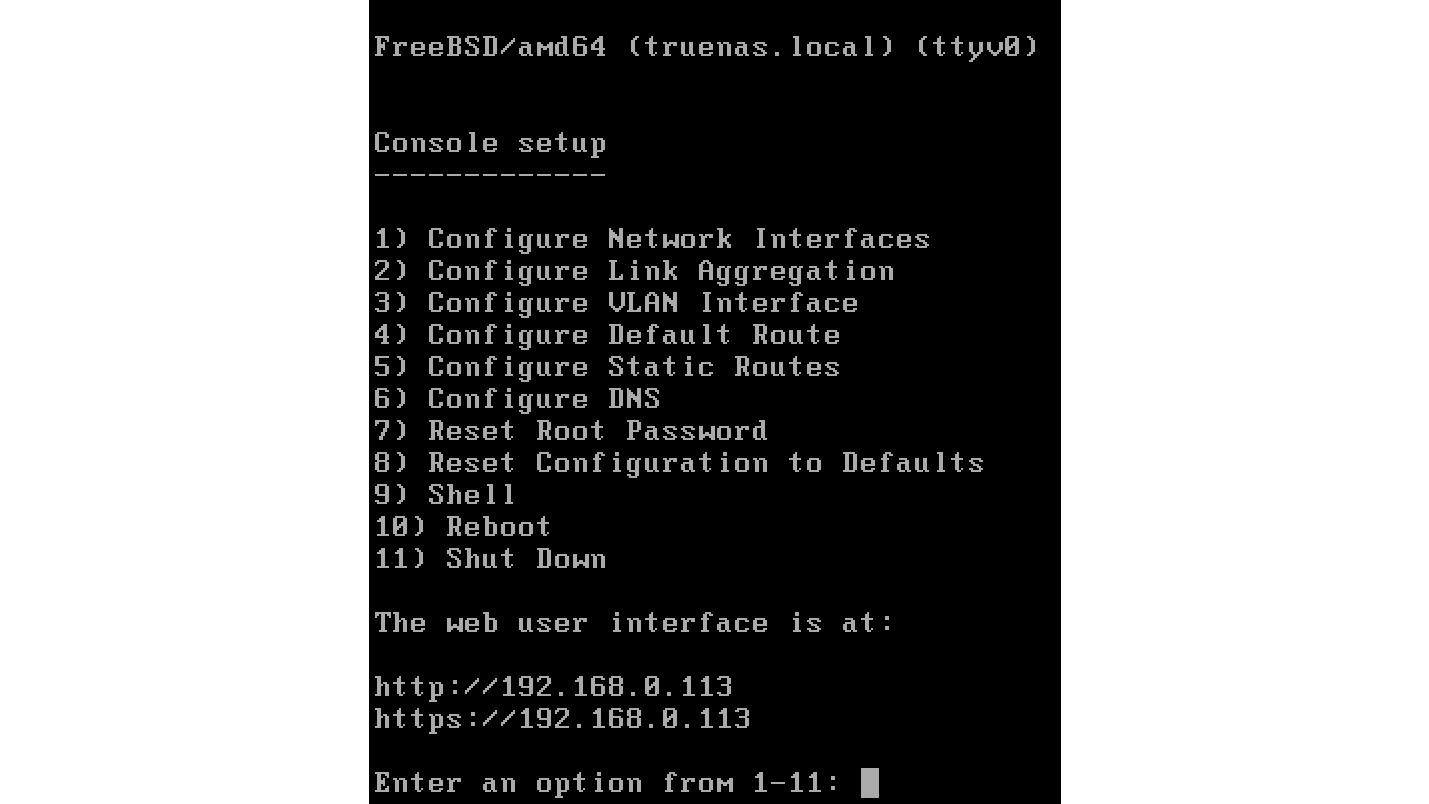 In het opstartmenu kies je deze keer Boot TrueNAS en enige tijd later verschijnt een uitgebreid menu met elf opties. Onderaan dit menu zou je, als alles goed is, het interne ip-adres van je TrueNAS-machine moeten zien.