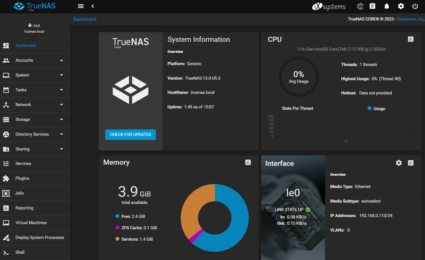 Meld je aan bij TrueNAS met root als gebruikersnaam en met het eerder ingestelde wachtwoord. Hiermee kom je op het dashboard terecht, waar je nuttige systeeminformatie en verschillende secties zoals Accounts, Network, Storage en Plugins vindt.