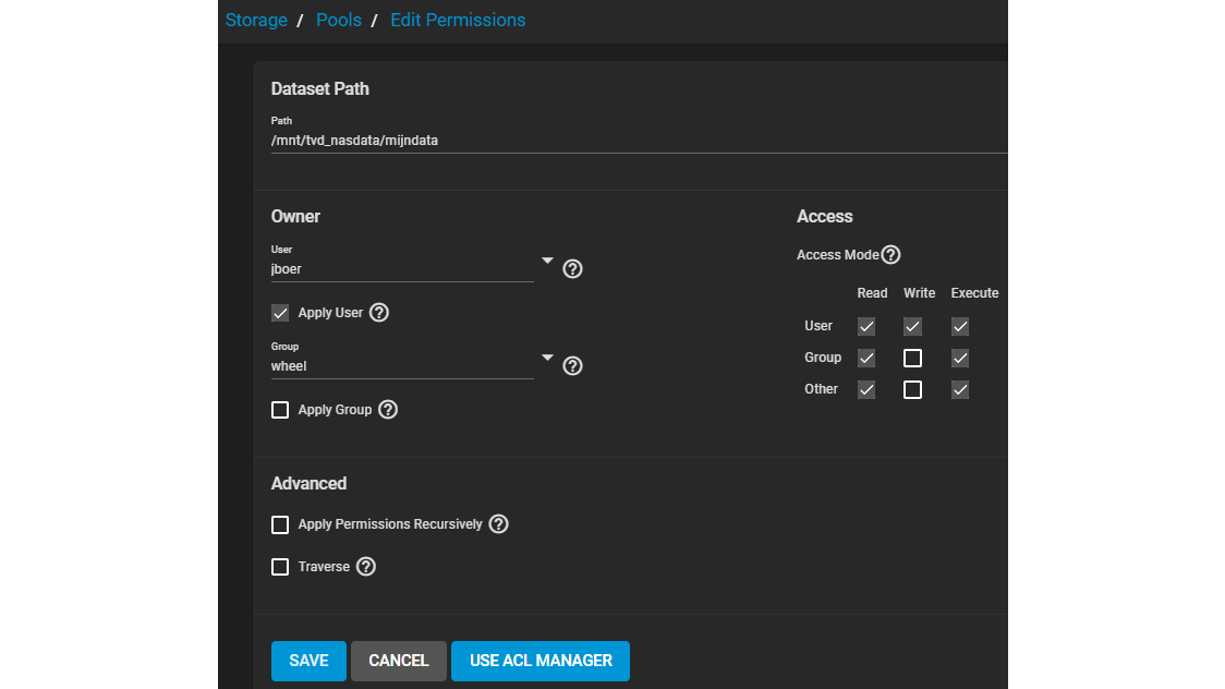 In het pooloverzicht klik je naast de nieuw gecreëerde dataset op het knopje met de drie stippen en selecteer je Edit Permissions. Bij User kies je het zojuist toegevoegde gebruikersaccount en zet je een vinkje bij Apply user, zodat de gebruiker de hier aangevinkte rechten (standaard Read, Write en Execute) krijgt toegewezen. Bevestig met Save.