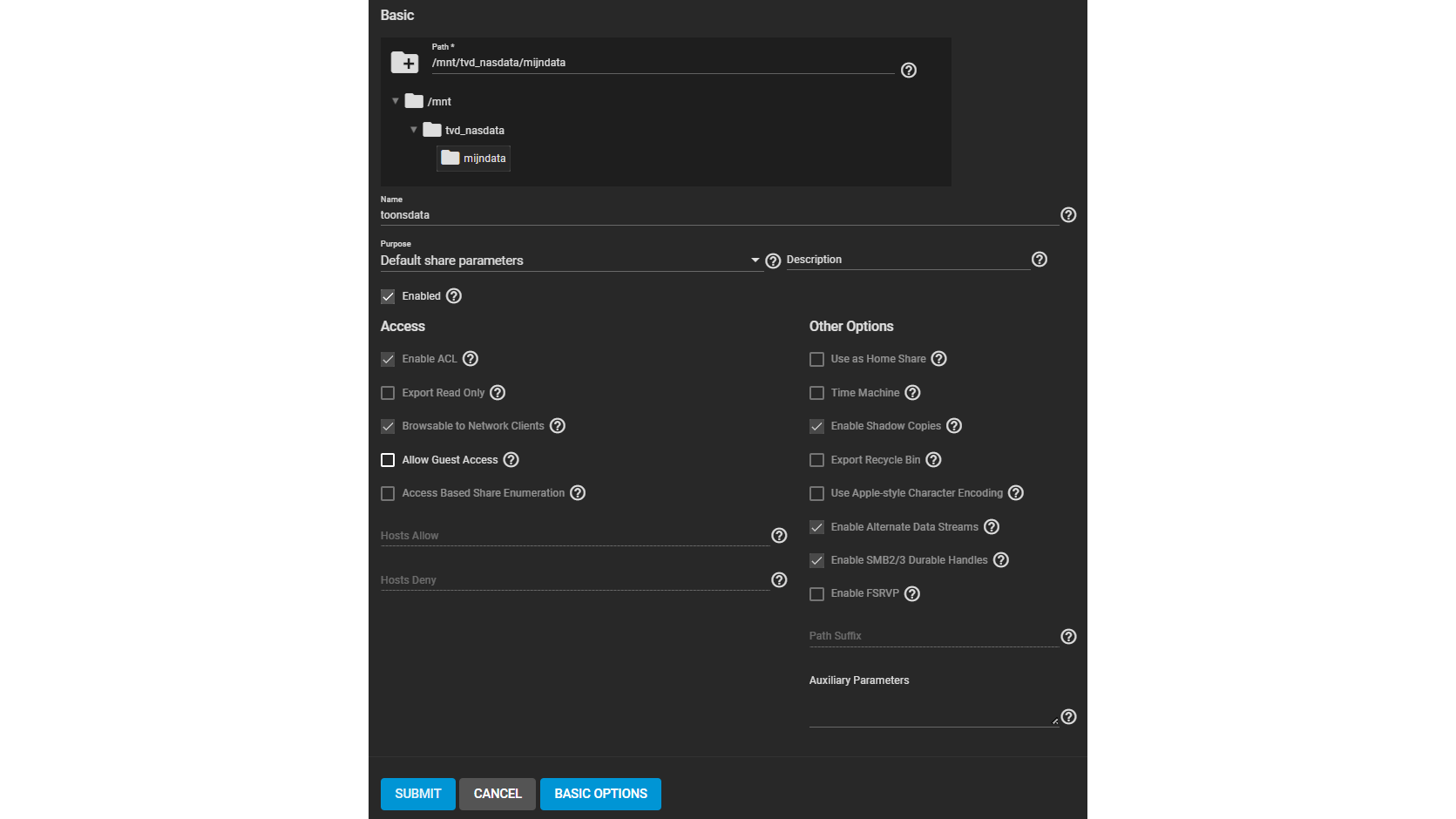 Je kunt ook Advanced Options openen, maar wijzig hier alleen iets als je precies weet wat je doet. Bevestig je aanpassingen met Submit. Je krijgt een vraag of je de SMB-service wilt activeren. Bevestig dit met Enable service en klik op Close. Je kunt de vraag over het instellen van machtigingen voor deze dataset (voorlopig) negeren met Cancel.