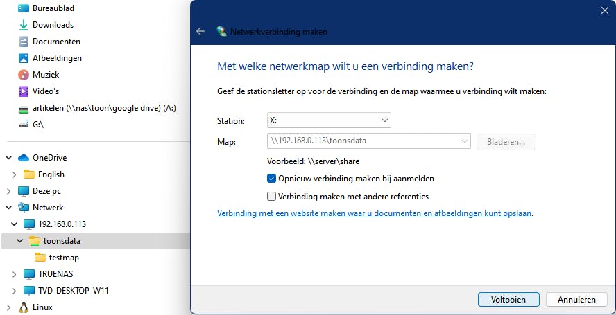 Om frequent gebruik van je NAS-map te vergemakkelijken, kun je een permanente netwerkverbinding instellen. Open Verkenner en open onderaan het navigatievenster het gedeelte Netwerk. Daal af tot bij je share, klik erop met de rechtermuisknop en selecteer Netwerkverbinding maken. Kies een beschikbare stationsletter en controleer het pad (bij ons was dit: \\192.168.0.113\toonsdata). Laat het vakje bij Opnieuw verbinding maken bij aanmelden aangevinkt en klik op Voltooien.