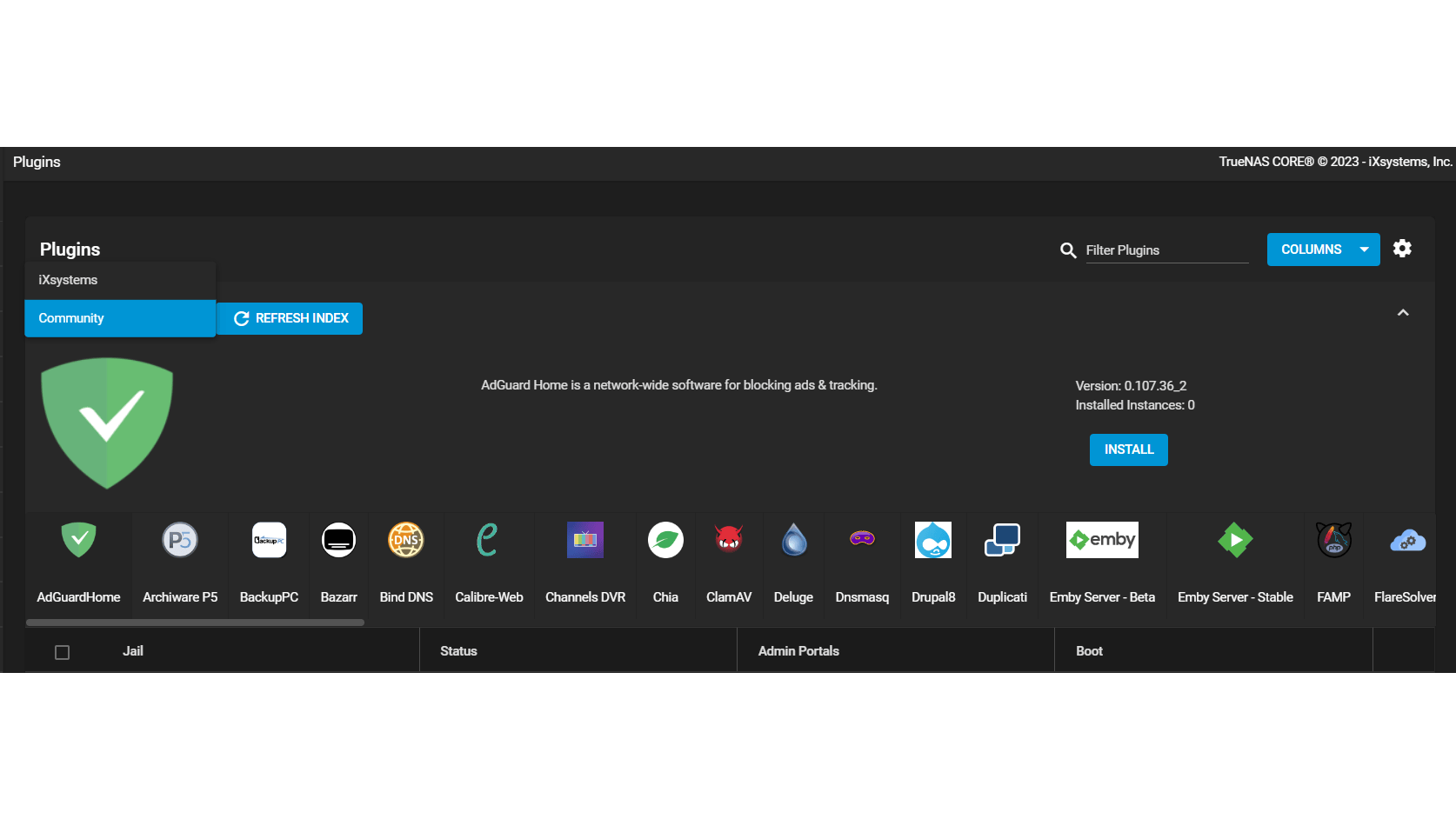 Wanneer je dit voor de eerste keer opent, moet je aangeven in welke pool je plug-ins wilt opslaan via Choose. TrueNAS kiest standaard voor de iXsystems-collectie met bekende exemplaren zoals Nextcloud, Plex Media Server en Syncthing. In het uitklapmenu kun je ook Community kiezen. Deze bevat tientallen plug-ins, waaronder AdGuardHome, ClamAV, Drupal8, Duplicati, Emby Server, JellyFin, MariaDB Server, n8n, NxFilter, OpenVPN Server, qbittorrent, Sabnzbd en meer.