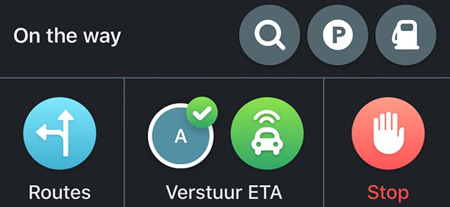 Je kunt je contactpersonen via Waze heel eenvoudig laten weten hoe laat je arriveert. Wanneer je je route hebt ingepland en gestart, verschijnt er een menu met daarin onder andere een groene knop met een auto en daaronder de tekst Verstuur ETA (hetgeen staat voor estimated time of arrival).