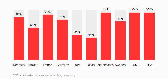 Dat blijkt uit een wereldwijd onderzoek van F-Secure. 43 procent van de Nederlandse bazen heeft zijn werk-emailadres gekoppeld aan een dienst die in het verleden wel eens is gehackt, waardoor hun wachtwoorden op de tocht staan. Nederland staat daarmee in de top 3, naast Finland (40 procent) en Denemarken (62 procent).