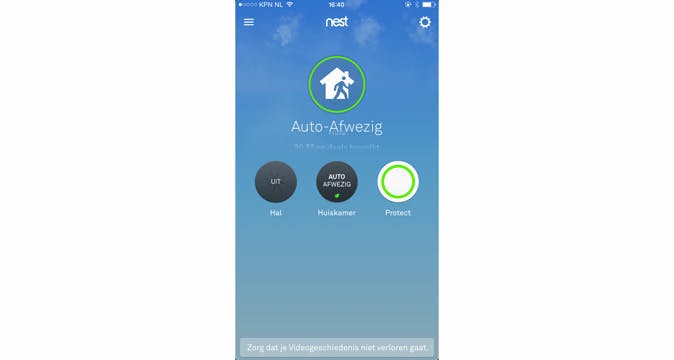 Je kunt de camera altijd aan laten staan, maar mogelijk vind je het geen prettig idee om gefilmd te worden terwijl je thuis bent. Als je een abonnement hebt, wordt alles wat de camera ziet bovendien ook nog opgeslagen. Via de app kun je de camera in- en uitschakelen. Het is gelukkig ook mogelijk om de camera automatisch uit te schakelen als je thuis bent en automatisch in te schakelen als je weg gaat. Dit kun je snel via het hoofdscherm van de app doen. Helemaal automatisch kan dit niet en dat is vreemd. Gebruik je een ook een Nest-thermostaat, dan kan de thermostaat je huis ook automatisch op afwezig zetten. Dit heet in de app Auto-Afwezig. De Nest Cam schakelt echter niet mee met deze stand en sprint dus niet aan op Auto-Afwezig. Heb je een Nest Thermostaat en schaf je ook een Nest Cam aan, zet dan handmatig je huis op Afwezig. Behalve op status, kun je de camera ook aan en uit zetten op basis van een zelfgekozen tijdschema.