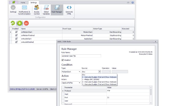 De Windows-client wordt gebruikt om het programma te configureren. Het is ingedeeld in twee tabbladen. Op het tabblad Home vind je de mogelijkheid om webcambeelden te bekijken en andere webcams toe te voegen. Ook kun je hier het log bekijken en de bestandsbibliotheek inzien. Op het tabblad Settings kun je via de knop Notifications diverse berichtservices instellen zoals een sms-notificatie, e-mailnotificatie en FTP- en netwerksynchronisatie. Met de knop Access Control voeg je gebruikersaccounts toe en kun je er verschillende rechten aan toekennen. Verder is met mogelijk om zelf regels te maken en hier variabelen aan toe te voegen.