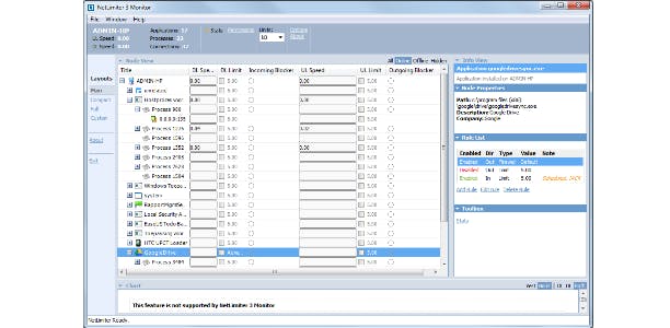 Op de website vindt u zowel een 32- als een 64bit-versie van het programma. De installatie hebt u met een paar muisklikken voor elkaar. Wel moet u de installatie van een paar additionele drivers en een herstart van Windows op de koop toenemen. Standaard start NetLimiter op met Windows en nestelt het zich in het systeemvak. NetLimiter 3 Monitor vereist wel een gratis registratie. De link hiervoor vindt u op de downloadpagina van de site en de code die u daarop via e-mail ontvangt, kunt u invoeren bij Help / Register.