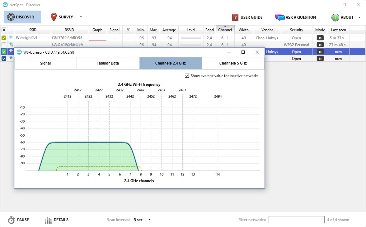 De discover-modus van NetSpot is wellicht het minst spectaculair (ook al omdat je deze functie in andere, gratis wifi-analyzers terugvindt). Je krijgt in real time een overzicht van alle draadloze netwerken die NetSpot op die locatie detecteert. Het programma vermeldt zo goed als alle belangrijke gegevens van de gevonden netwerken: (B)SSID, signaalsterkte (zowel in een grafiek als in dBM-waarden), de zwakste, sterkste en gemiddelde signaalsterkte die werd gemeten, de wifi-band (2,4 of 5 GHz), het kanaal en de kanaalbreedte, de beveiliging (o.a. Open, WEP, WPA2 Personal) en de netwerkmodus (bijvoorbeeld 802.11n).