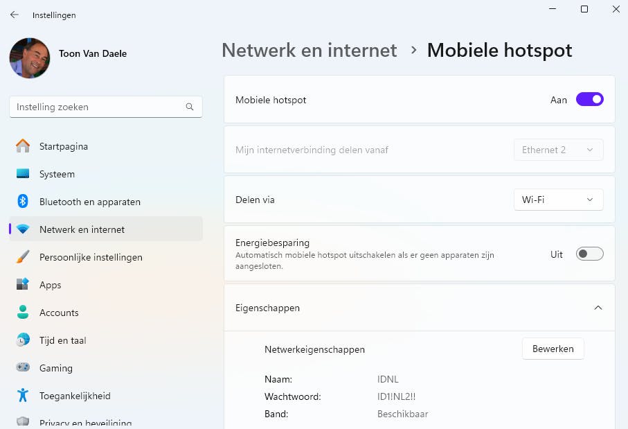 Als je Windows-pc een bekabelde verbinding en wifi heeft, kun je een mobiele hotspot instellen. Ga in Windows naar Instellingen / Netwerk en internet. Open Mobiele hotspot en schakel deze in. Kies bij de optie Mijn internetverbinding delen vanaf de actieve ethernetverbinding. Stel Delen via in op Wi-Fi (of kies eventueel Bluetooth). Druk bij Eigenschappen op Bewerken, voer een Netwerknaam en Netwerkwachtwoord in. Stel Netwerkband in op Beschikbaar (of kies 5 GHz of 2,4 GHz). De optie Energiebesparing laat je het best uitgeschakeld.