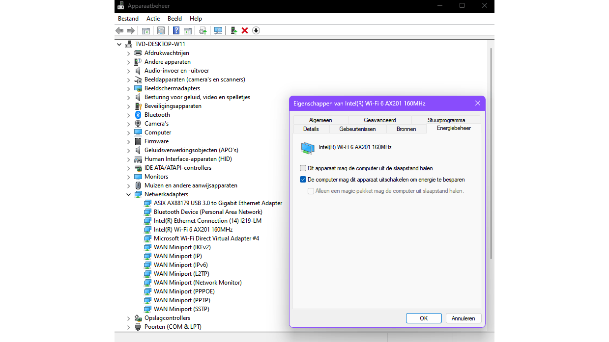 Om te vermijden dat je netwerkadapter zomaar uitvalt wanneer je systeem in slaapstand gaat, ga je naar het Apparaatbeheer. Bijvoorbeeld door op Windows-toets+R te drukken en devmgmt.msc uit te voeren. Open Netwerkadapters, klik met rechts op de betreffende netwerkadapter en kies Eigenschappen. Ga naar het tabblad Energiebeheer en verwijder het vinkje bij De computer mag dit apparaat uitschakelen om energie te besparen. Plaats geen vinkje bij Alleen een magic-pakket […].