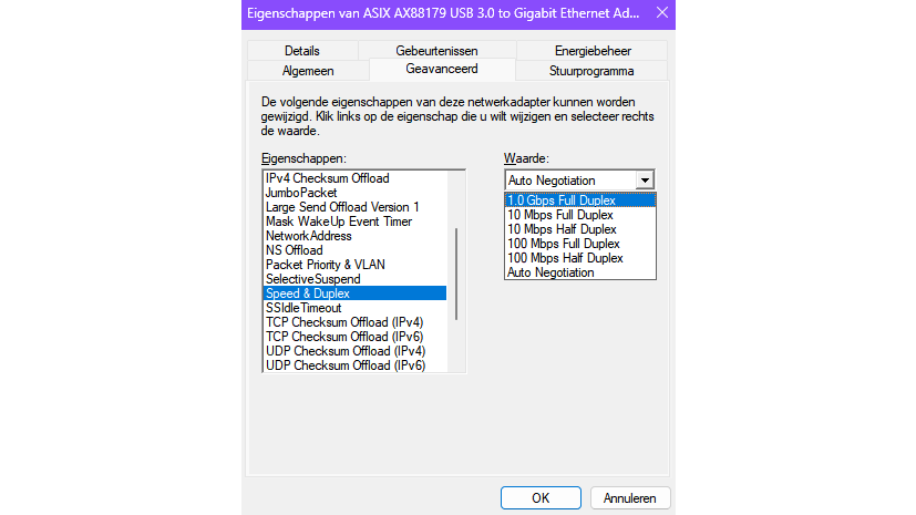 We blijven even in het Apparaatbeheer. In het contextmenu Eigenschappen van je netwerkadapter vind je het tabblad Geavanceerd. Hier vind je diverse instellingen voor je netwerkadapter. Met Speed & Duplex pas je de verbindingssnelheid aan, bijvoorbeeld bij het oplossen van connectieproblemen. Bij intensieve dataoverdracht binnen je lokale netwerk, zoals naar je NAS, kun je de waarde van de optie Jumbo Packet tijdelijk verhogen, naar bijvoorbeeld 9000 bytes.
