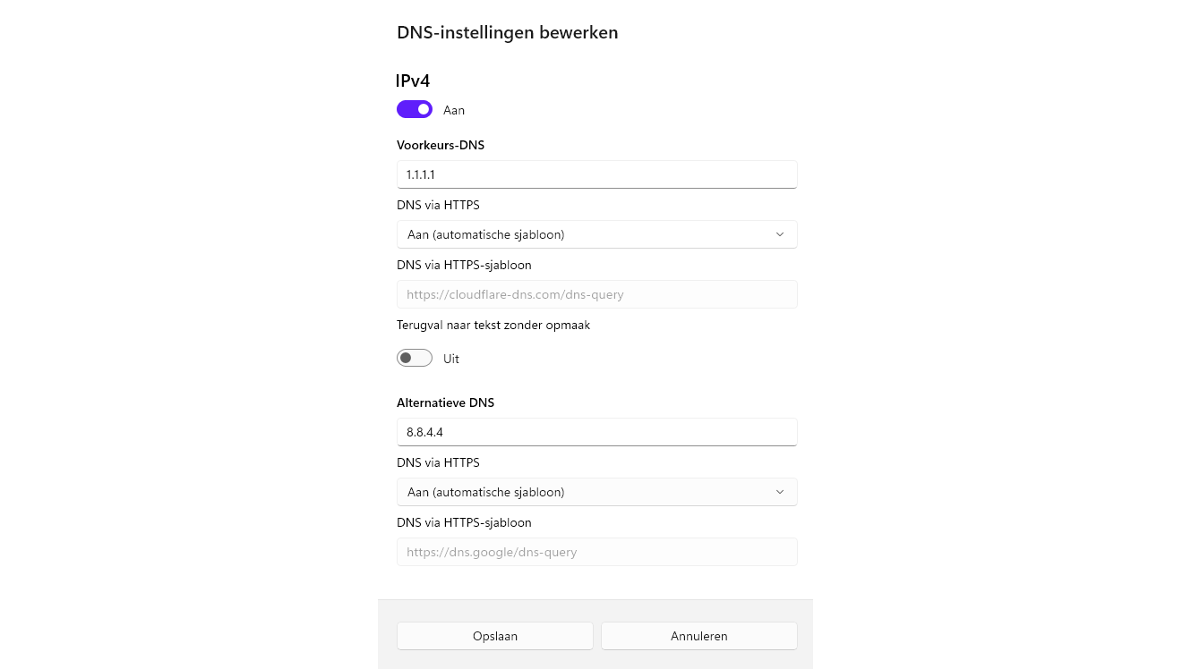 Wil je niet dat je provider via je DNS-aanvragen ziet waar je naartoe gaat met je browser, dan kun je deze in Windows versleutelen. Ga naar Instellingen / Netwerk en internet. Kies Ethernet of Wi-Fi en Hardware-eigenschappen. Klik bij DNS-server toewijzing op Bewerken. Stel in op Handmatig (voor IPv4) en zet DNS via HTTPS (DoH) op Aan (automatische sjabloon). Vul bij Voorkeurs-DNS en Alternatieve DNS het ip-adres van een publieke DoH-server in, zoals Google (8.8.8.8 en 8.8.4.4) of Cloudflare (1.1.1.1 en 1.0.0.1). Windows vult zelf de bijbehorende url in bij DNS via HTTPS-sjabloon. Bevestig met Opslaan. De beheerder van de DNS-server ziet uiteraard wel waar je heengaat.