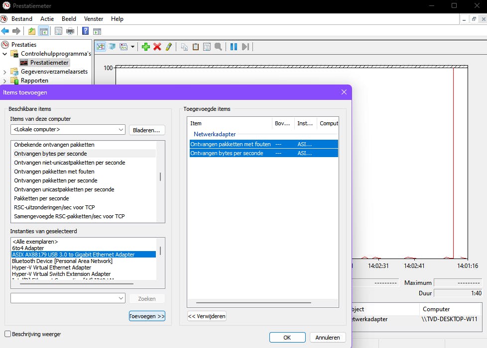 Je kunt nu specifieke items selecteren, zoals Ontvangen bytes per seconde en Uitgaande pakketten met fouten. Kies in het onderste deelvenster het gewenste item, zoals je ethernet- of wifi-adapter. Voeg de geselecteerde items toe via de knop Toevoegen en bevestig met OK voor een live grafiekweergave.