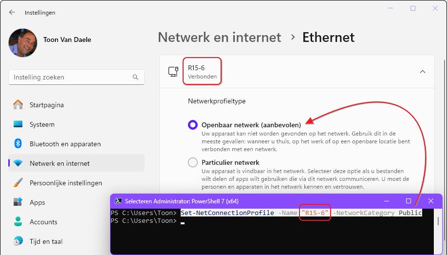 Je kunt ook via PowerShell schakelen van netwerkprofiel.