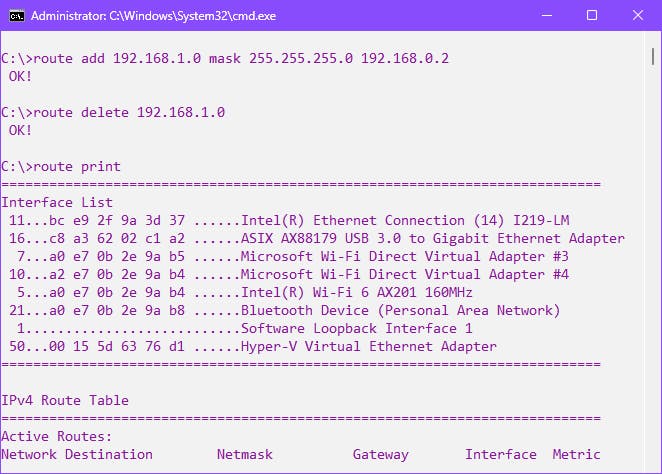 Met route print vraag je de actuele routes op en met route delete 192.168.1.0 verwijder je deze route weer.